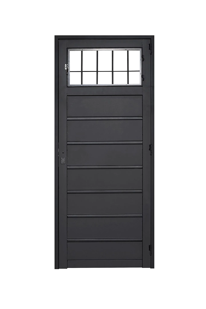 Marco de acero plegado Nº19(espesor 1.10 mm) Hoja compuesta por caño de acero estructural 30 x 70 mm y lamina de acero estampada en una sola pieza con molduras horizontales Postigo en caño de acero estructural 15 x 20 mm Reja en hierro macizo redondo de 12 mm con planchuela de acero de 7/8 x 1/8 Cerraduras de seguridad (doble paleta) Bisagra de acero tipo munición Aldaba de acero zincada Terminación en antioxido al cromato de zinc.